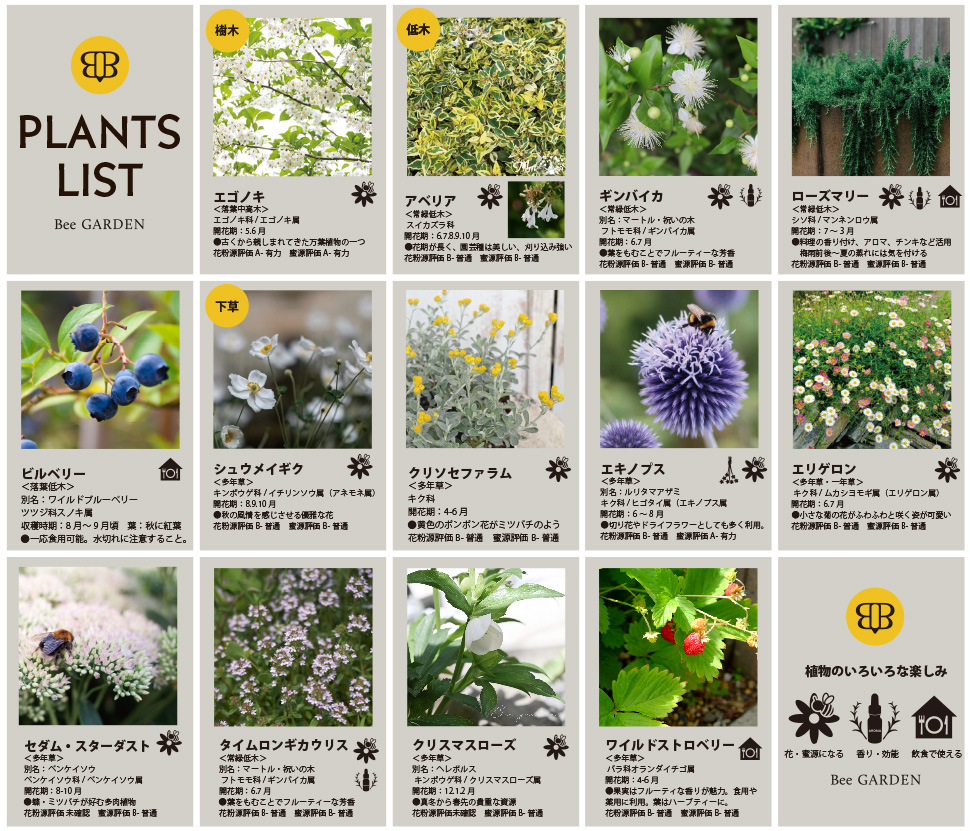 Bee GARDENがおすすめする、ミツバチも好む植物の一例です。庭植えにも適して、育てやすいものを選んでいます。