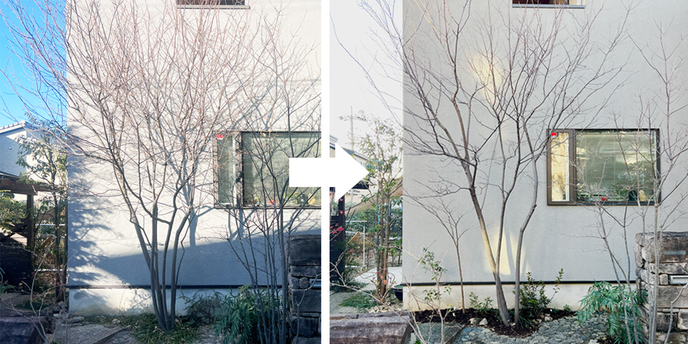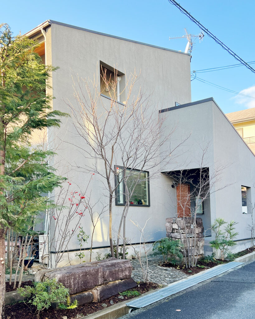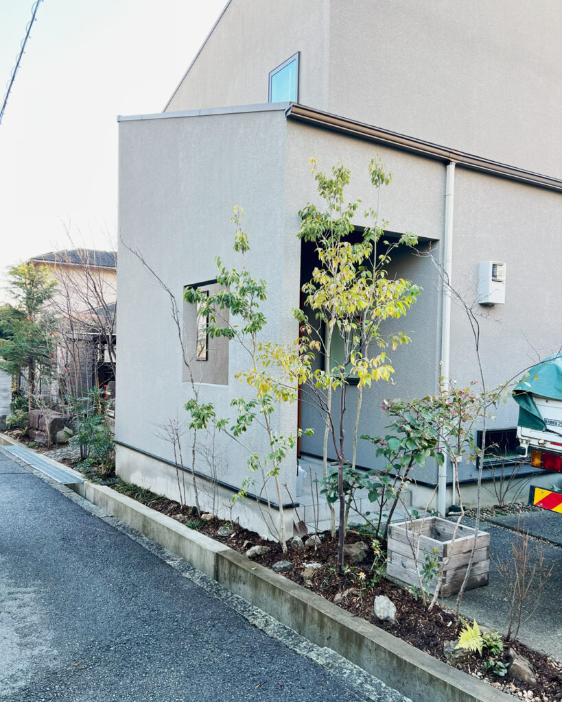 美しいグレーの外観に、柔らかな雑木の枝ぶりが本当によく映えます。