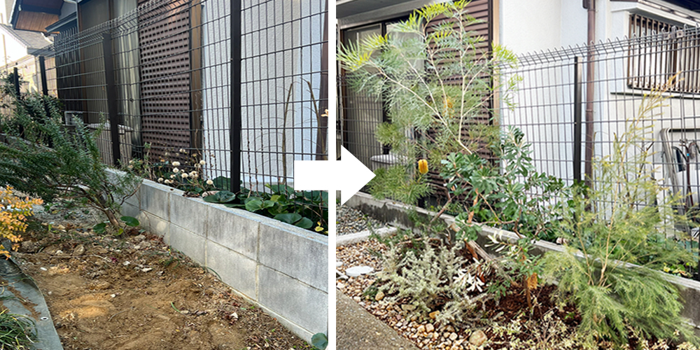 Before(左)の土が見える状態から、After(右)へ。 円柱状の花が特徴のバンクシアや、繊細な葉が美しいグレビレアなど、個性の強い植物たちを密度高く配置することで、お隣からの視線がお洒落に和らぐ「目隠し」としても機能してくれます。