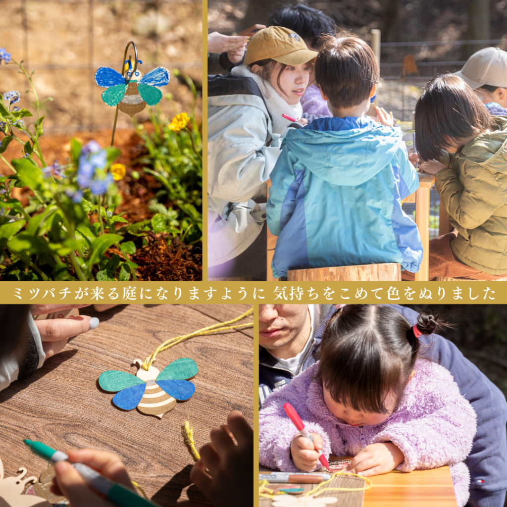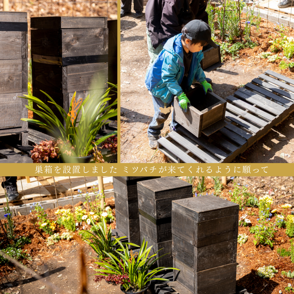 参加くださったお子さんの温かい手で植えられた色とりどりの花々、設置された巣箱。 静かだった場所に、子どもたちの笑い声と「ミツバチさん、おいで!」という願いが加わって、私たちのBee GARDENが動き出しました。