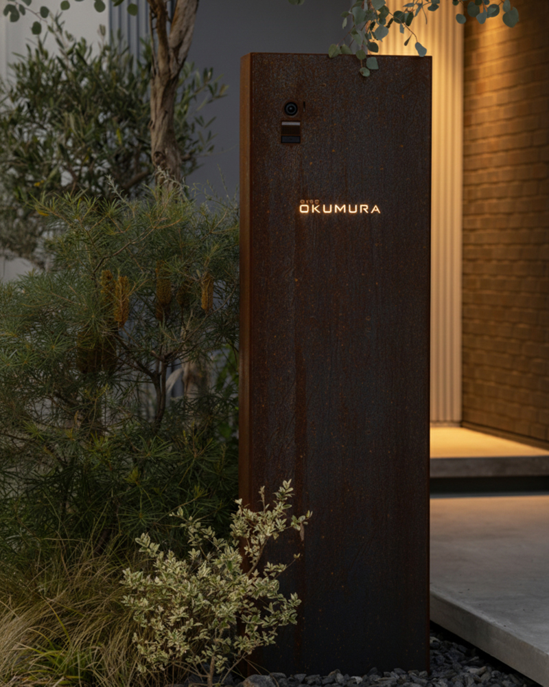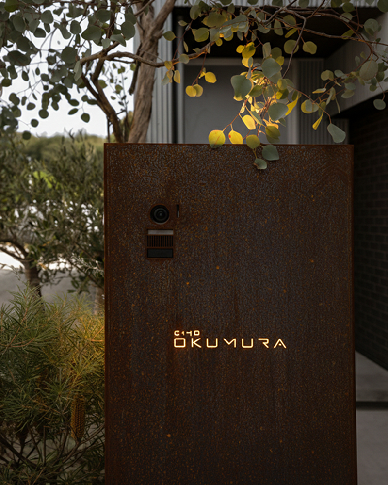 コールテン鋼を用いた門柱は、建築の佇まいにふさわしい素材美を備えています。